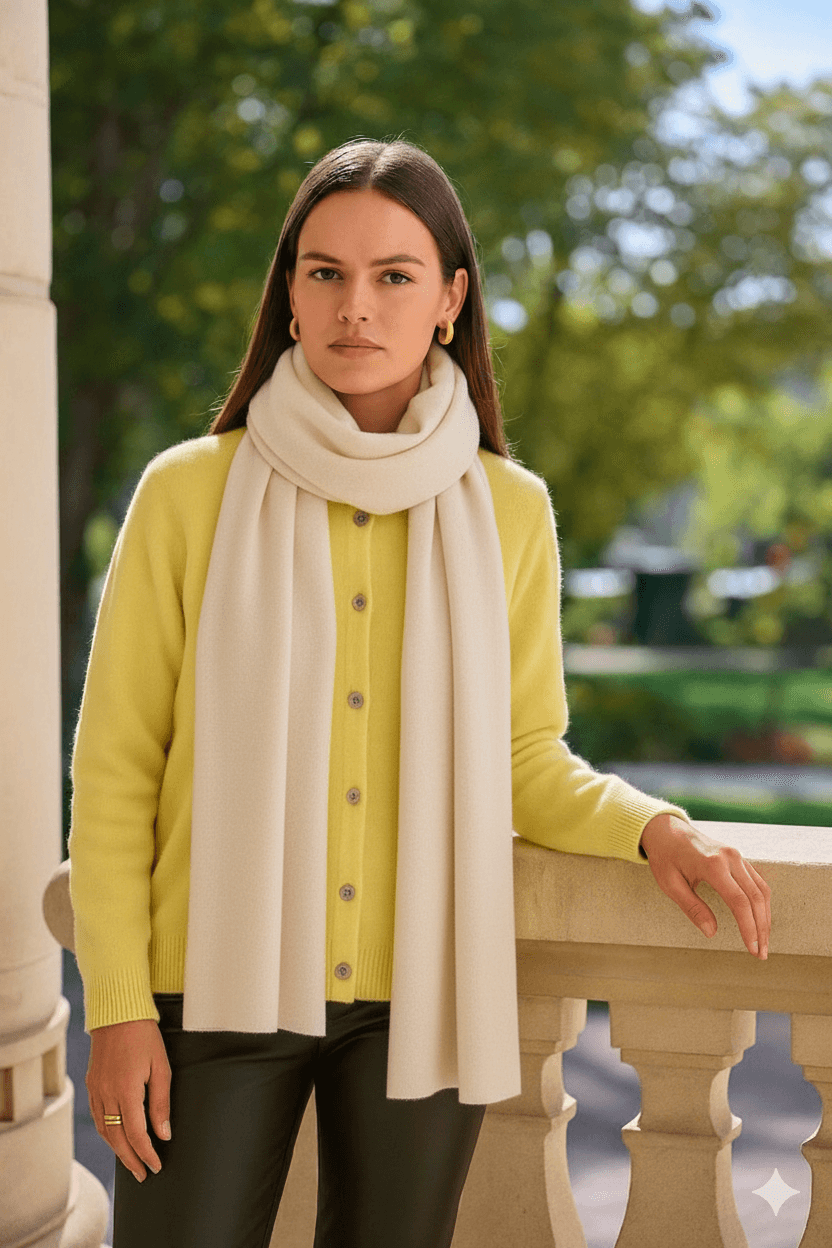 Écharpe mi-longue en maille cachemire, douce et polyvalente. Facile à porter au quotidien, elle se stylise de multiples façons pour compléter toutes vos tenues.