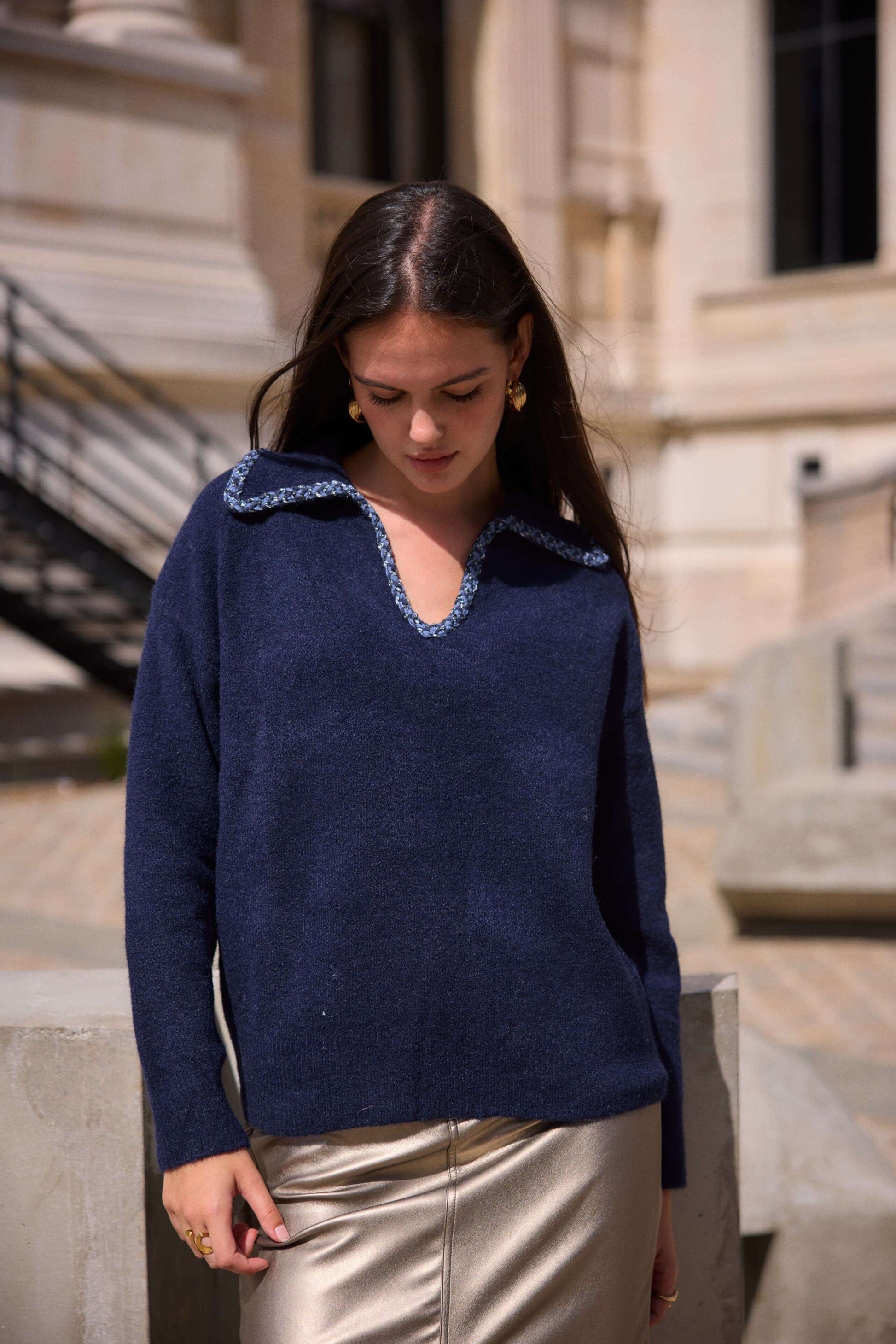 Pull femme bleu marine en laine col brodé détail jean - Olivia