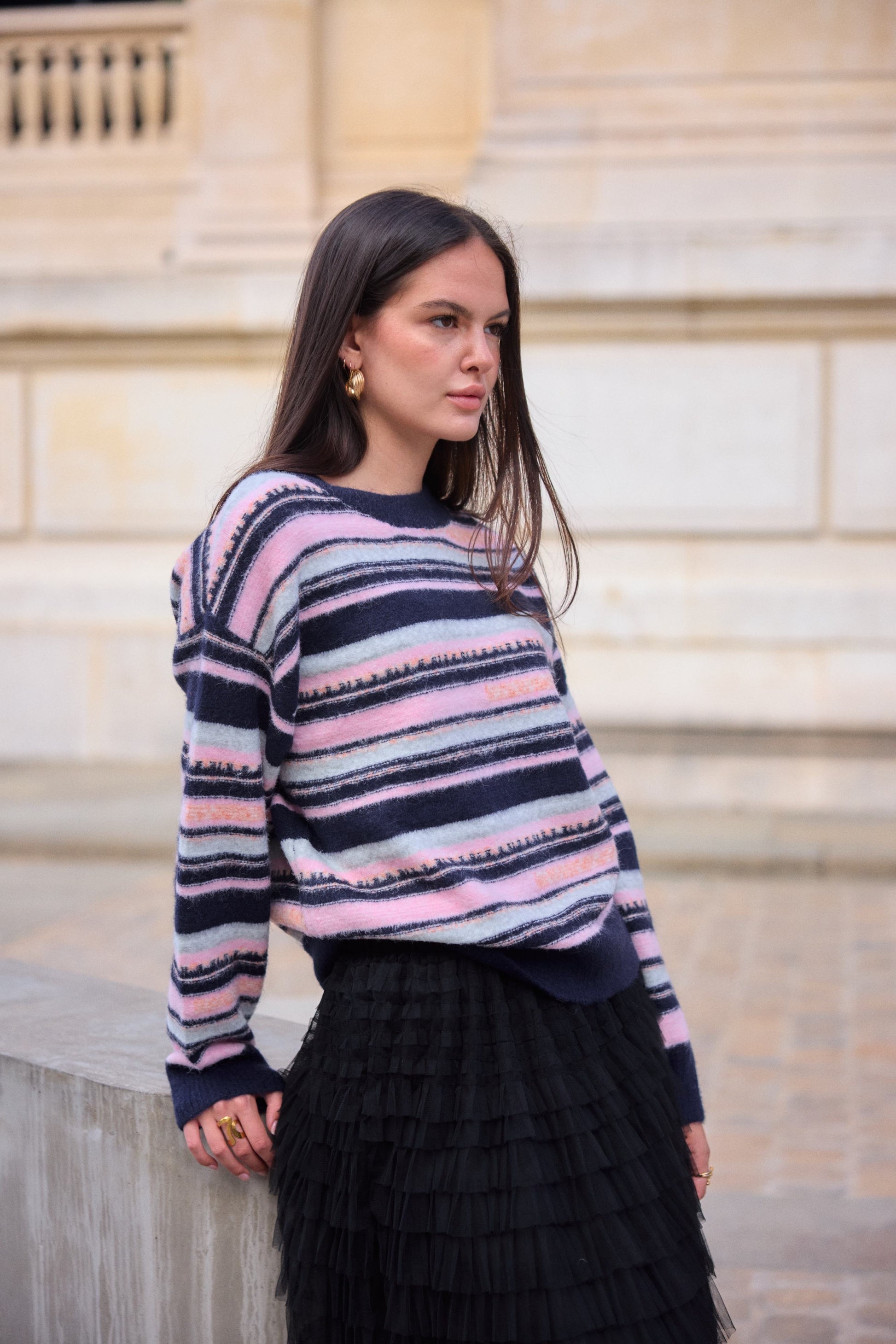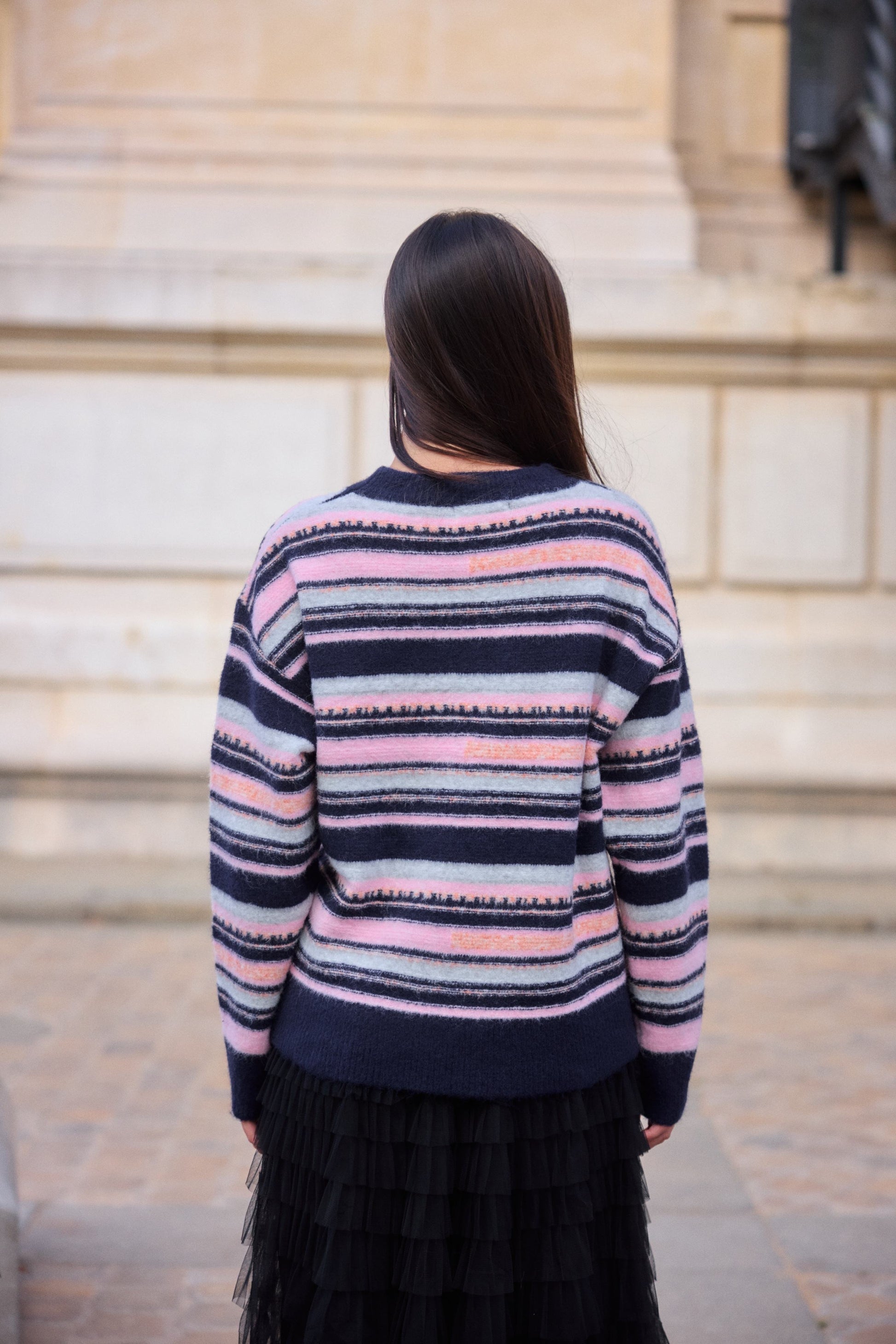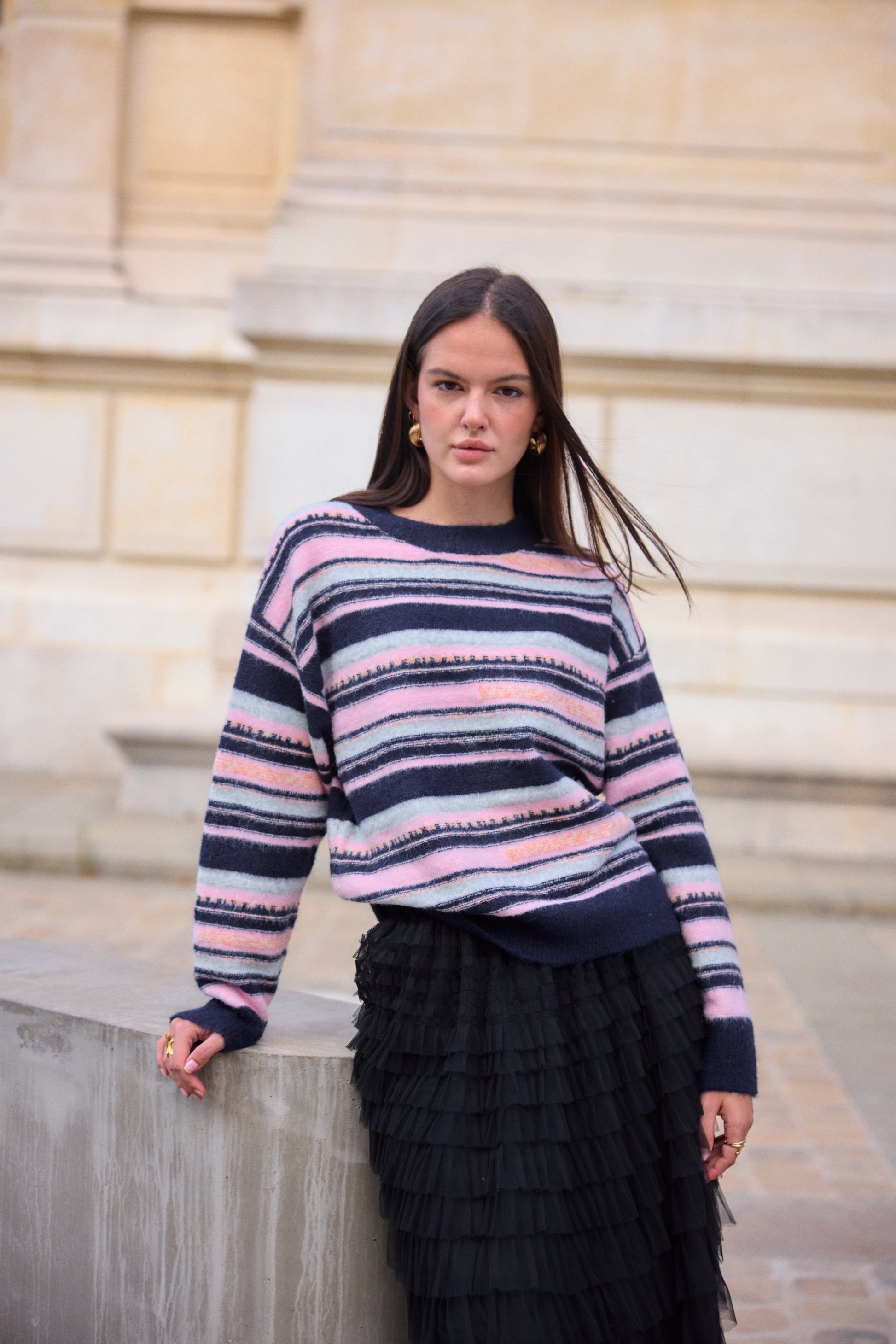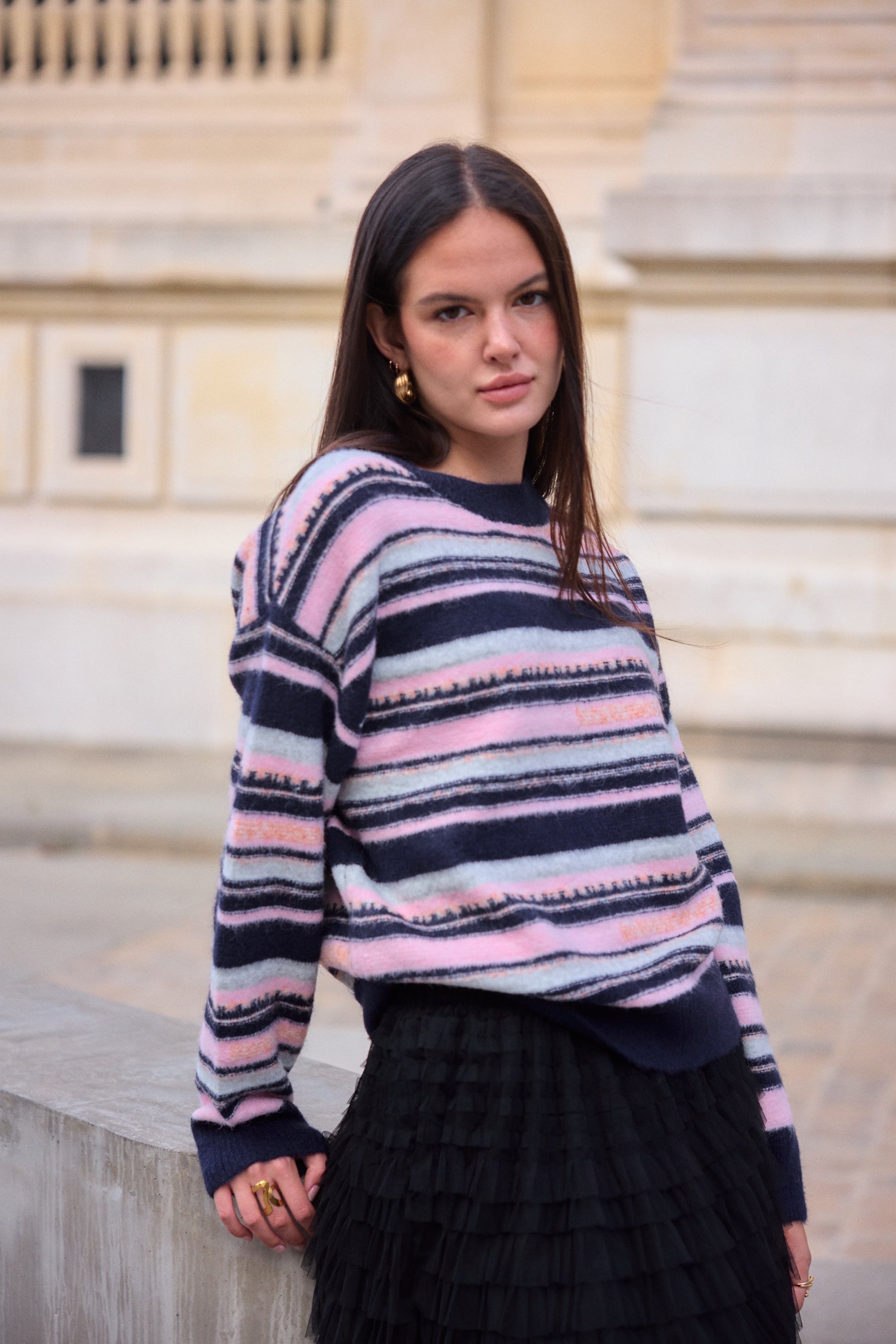 Pull manches longues, à encolure ronde, celui-ci à une coupe droite et agrémenté de détails de rayures. Notre modèle mesure 175 cm et porte une taille unique convient aux tailles standards européennes 36-46.